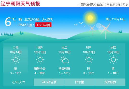 摘要:今天周日,想出去玩的小伙伴們可要抓緊時(shí)間,明天又要上班啦!10月14日,遼寧朝陽晴,最低氣溫3℃,最高溫度達(dá)到19℃,北風(fēng)3~5級(jí)。比照昨天,氣溫有所下降,出門記得多穿衣服。