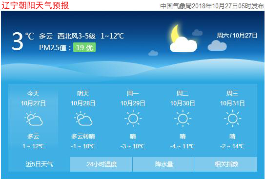 強(qiáng)冷空氣壓境,北方大部分地區(qū)受其影響出現(xiàn)了斷崖式降溫。今天(10月27日),遼寧朝陽(yáng)晴轉(zhuǎn)多云,氣溫1~12℃,西北風(fēng)3~5級(jí),空氣質(zhì)量?jī)?yōu),可以正常參加戶(hù)外活動(dòng)。