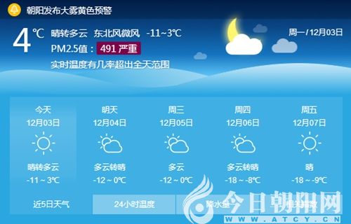 各位網(wǎng)友們,早上好!今天是2018年12月3日,星期一,遼寧朝陽晴轉(zhuǎn)多云,氣溫-11~3℃,也是本周最溫暖的一天。