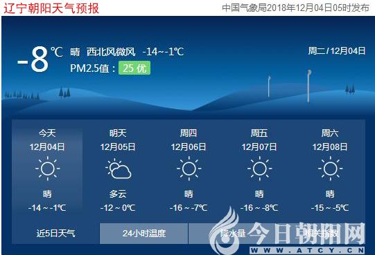 今天是2018年12月4日,星期二,農(nóng)歷十月二十七。遼寧朝陽(yáng)晴,最低氣溫-14℃,最高氣溫1℃,西北風(fēng)微風(fēng),空氣質(zhì)量?jī)?yōu)。日出時(shí)間:07:07;日落時(shí)間:16:29。