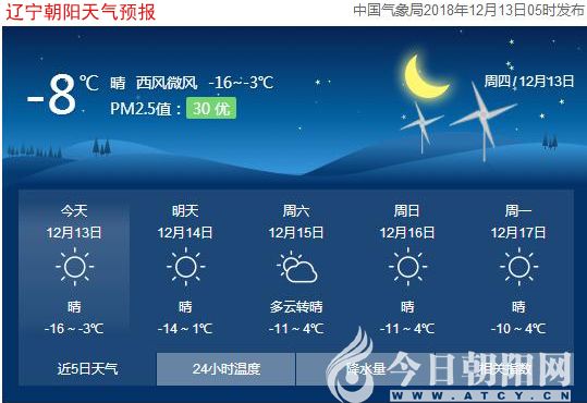今天是2018年12月13日,星期四,農(nóng)歷十一月初七。遼寧朝陽晴,氣溫-16~-3℃,西風(fēng)微風(fēng)轉(zhuǎn)西北風(fēng)4~5級,空氣質(zhì)量優(yōu)。日出時間:07:15;日落時間:16:28。