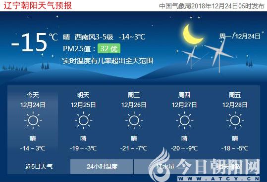 今天是12月24日,星期一,農歷十一月十八。遼寧朝陽晴,-14~3℃,西南風3~5級,空氣質量優(yōu)。日出時間:7:22,日落時間:16:32。