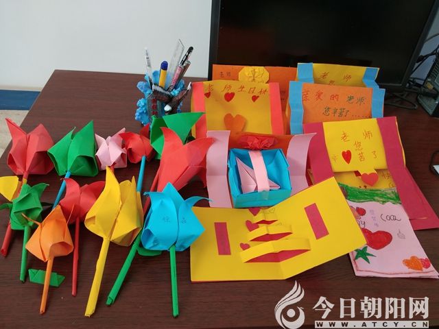 在推開門的一剎那,我驚呆了,學(xué)生異口同聲對我說生日快樂,手里都拿著自己用彩紙做的手工。再看看黑板,布置精心,寫著滿滿的祝福,我不禁熱淚盈眶,激動得無法言表。每個人的桌子上都擺著手工鮮花和賀卡,王宇鑫和馬明宇讓走讀生幫忙買了小蛋糕,王秋衡買了面包,劉華宇買了一袋餅干。我讓男女生分別站到講臺上,拿著自己的作品拍照,又把所有禮物擺在講桌上,變換著角度照相。我把吃的還給學(xué)生,手工作品全部收下,裝在一個大塑料袋里珍藏起來。這些不是簡單的賀卡和小花,這是孩子們真情實感的表達(dá)。