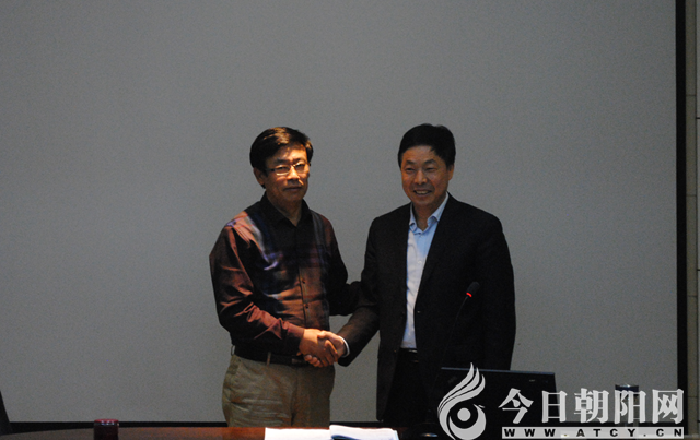 朝陽市教育局教師教育科科長陳昭宇與吳積軍校長合影