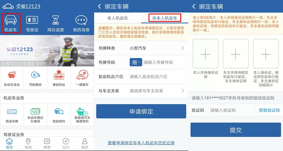 第二步:在首頁選擇“機動車”進入綁定車輛頁面,選擇“非本人機動車”,按照提示提交相應(yīng)的資料信息: