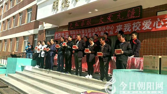 4月20日上午,遼寧朝陽大愛無疆公益幫扶中心建平縣服務隊到建平縣義成功鄉(xiāng)明德小學開展了扶貧助學活動。朝陽市關工委,建平縣教育局、關工委,義成功鄉(xiāng)政府等機關單位的負責人參加了助學活動。