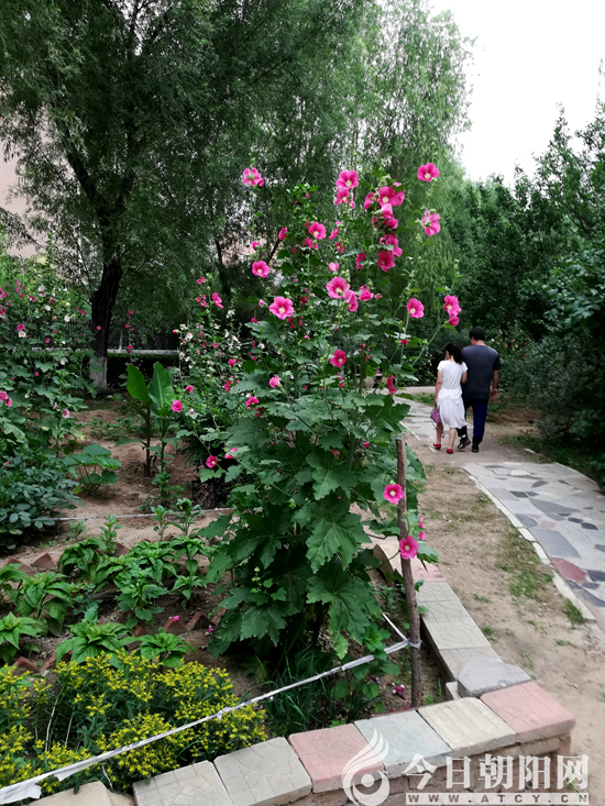 陳師傅養(yǎng)花最成功、美化效果最佳的地方是銅錢廣場(此乃文友王中原私下命名)北側花園處。園里花的品種很多,但數(shù)量最大、開得最旺的是蜀葵,別名“一丈紅”,遼西人稱“秫秸花”。連大帶小有百八十棵,此花雖不名貴,但因花秧長得粗壯高大,大的主干有小孩胳膊粗細,枝繁葉茂、形似寶塔。此花優(yōu)點是,開得早、花期長,開花時上下同時開?;ò暧袉螌拥?,也有多層的?;ㄉG麗多樣,紅橙黃綠藍紫俱全。近日正是盛花期,整個花園姹紫嫣紅、蜂飛蝶舞、美不勝收。