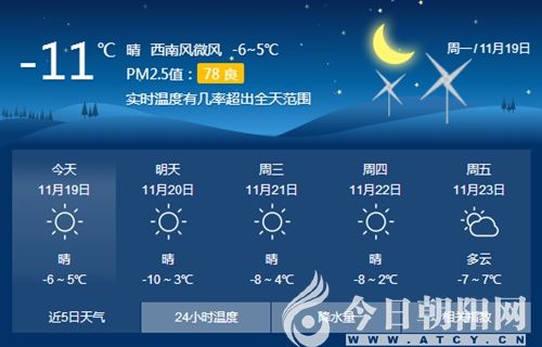 今天(11月19日),遼寧朝陽(yáng)晴,最低氣溫-6℃,最高氣溫5℃,同時(shí)伴有3~5級(jí)的西南風(fēng)。