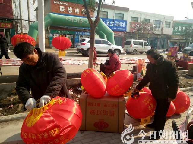 在熱鬧的街道上,有兩位賣燈籠者正在整理燈籠懸掛展示,給新年增添了紅紅火火的氣氛。