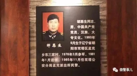 1960年9月10日,鄒恩生出生于朝陽市雙塔區(qū)孟克鄉(xiāng)東三家村。1987年6月入黨,1978年中學畢業(yè)后參軍,1981年復員回到家鄉(xiāng)蘋果園務農,1985年4月被朝陽市公安局雙塔公安分局招聘為鄉(xiāng)辦民警,1989年轉為事業(yè)編制民警。