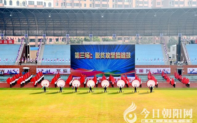 第三場(chǎng)《脫貧攻堅(jiān)擂戰(zhàn)鼓》,表達(dá)了朝陽(yáng)萬(wàn)千凌河兒女不忘初心,牢記使命,在市委、市政府的正確領(lǐng)導(dǎo)下,脫貧攻堅(jiān)建設(shè)家鄉(xiāng)的雄心壯志。朝陽(yáng)銀行青年員工組成方隊(duì)擂響戰(zhàn)鼓,朝陽(yáng)工校百余名學(xué)生揮舞著大旗,新時(shí)代遼寧精神,“長(zhǎng)子情懷、忠誠(chéng)擔(dān)當(dāng)、創(chuàng)新實(shí)干、奮斗自強(qiáng)”以及“抓住機(jī)遇,迎難而上;脫貧攻堅(jiān),勇于擔(dān)當(dāng);黨建統(tǒng)領(lǐng),精準(zhǔn)扶貧;2020,實(shí)現(xiàn)小康”震耳欲聾的口號(hào)聲在會(huì)場(chǎng)上空久久回蕩……