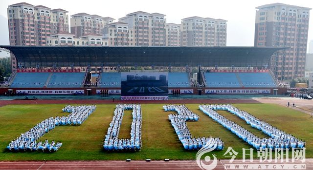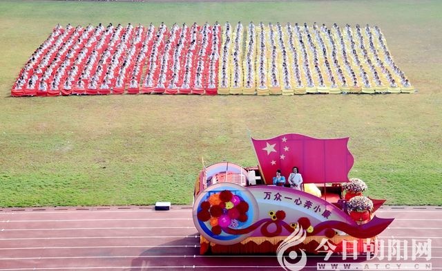 第四場(chǎng)《萬(wàn)眾一心奔小康》,由朝陽(yáng)師專(zhuān)800人組成的大型方陣,手持固定正反兩色彩綢方塊,以色彩拼圖的方式,在表演區(qū)變幻成鳳山凌水、巍峨雙塔、高鐵符號(hào)、滾滾麥浪、萬(wàn)眾一心奔小康等圖案,將團(tuán)體操的主題深化,將整場(chǎng)演出推向高潮。