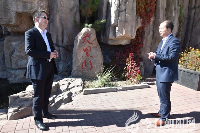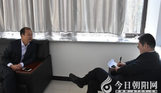 《朝陽日報(bào)》記者劉貴成(左)采訪遼寧大黑山旅游產(chǎn)業(yè)開發(fā)有限公司副總經(jīng)理陳書文(右)