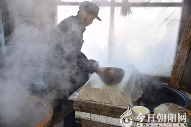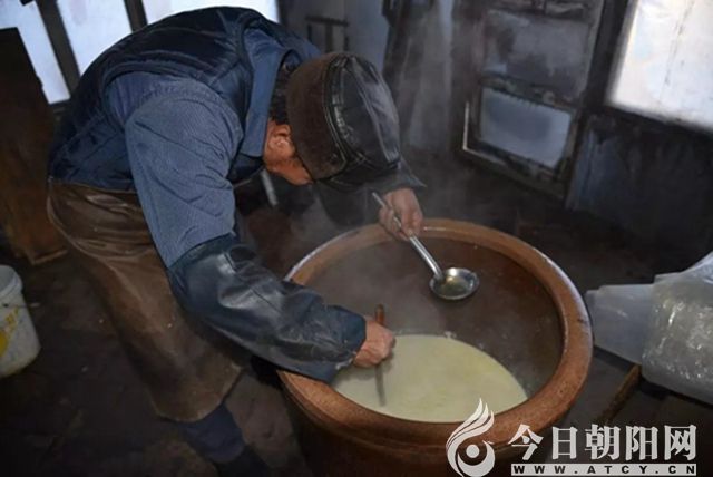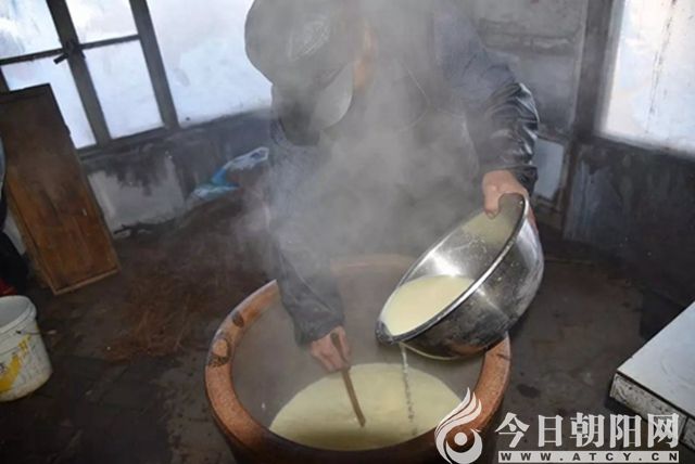豆?jié){磨好,用開水沏一下,過(guò)籮。就是在大鍋上放兩條扁擔(dān),扁擔(dān)上放一個(gè)箅簾子,箅簾子上兩人扯著一條比紗布要細(xì)得多的紡織品(豆腐包),將沏好的豆?jié){倒入,倆人盡全力擠壓,待豆腐包內(nèi)漿全部被擠出之后,俗稱的過(guò)籮就結(jié)束了。過(guò)籮后,籮上是豆腐渣,是做肉丸子等的重要原料,有的農(nóng)戶還將它當(dāng)成做大醬的補(bǔ)充原料。籮下的漿進(jìn)入鍋里,煮沸,豆?jié){燒開后,淘進(jìn)缸里,然后用勺子慢慢攪和。此時(shí),可以拿個(gè)碗,喝碗熱熱的豆?jié){了。