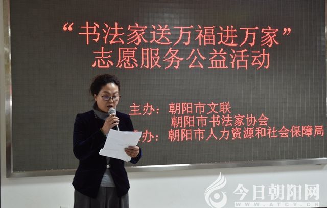 1月26日,農(nóng)歷臘月初十,由遼寧省朝陽市文聯(lián)、市書法家協(xié)會主辦,市人力資源和社會保障局承辦的“書法家送萬福進萬家”志愿服務(wù)公益活動啟動儀式在朝陽勞動大廈4樓大廳舉行。