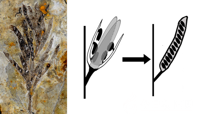 左圖,凌源新果的模式標(biāo)本;右圖,從裸子植物生殖器官到凌源新果心皮的演變。