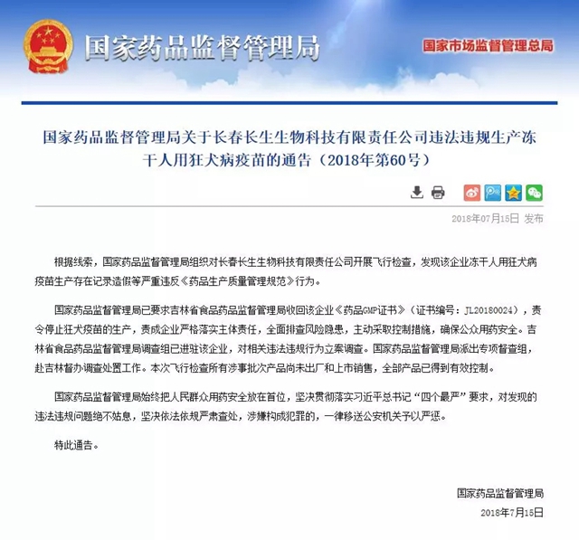 2018年7月15日國家藥品監(jiān)督管理局發(fā)布通告,發(fā)現(xiàn)長春長生生物科技有限責(zé)任公司凍干人用狂犬病疫苗生產(chǎn)存在記錄造假等嚴(yán)重違反《藥品生產(chǎn)質(zhì)量管理規(guī)范》行為。