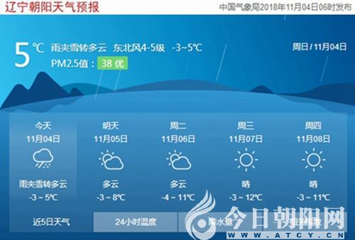 親愛的網(wǎng)友,大家早上好!小編準(zhǔn)時(shí)來(lái)為您報(bào)天氣啦。今天(11月4日),遼寧朝陽(yáng)雨夾雪轉(zhuǎn)多云,氣溫-3~5℃,東北風(fēng)4~5級(jí),空氣質(zhì)量?jī)?yōu)。由于天氣寒冷,晝夜溫差大且風(fēng)力較強(qiáng),請(qǐng)注意適當(dāng)增減衣物,加強(qiáng)自我防護(hù)避免感冒。另外,不宜洗車,未來(lái)24小時(shí)內(nèi)有雪,如果在此期間洗車,雪水和路上的泥水可能再次弄臟您的愛車。
