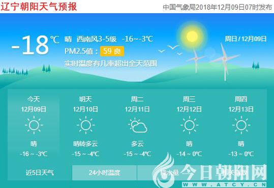 今天是2018年12月9日,星期日,農(nóng)歷十一月初三。遼寧朝陽(yáng)多云,氣溫-16~-3℃,西南風(fēng)3~5級(jí),空氣質(zhì)量良好。日出時(shí)間 07:12;日落時(shí)間 16:28。