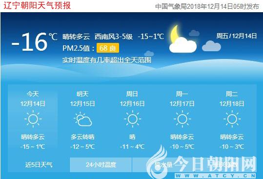 今天是2018年12月14日,星期五,農(nóng)歷十一月初八。遼寧朝陽晴轉(zhuǎn)多云,氣溫-15~1℃,西南風(fēng)3~5級(jí),空氣質(zhì)量良好,適宜開窗通風(fēng),外出無需戴口罩。日出時(shí)間:07:16;日落時(shí)間:16:28。
