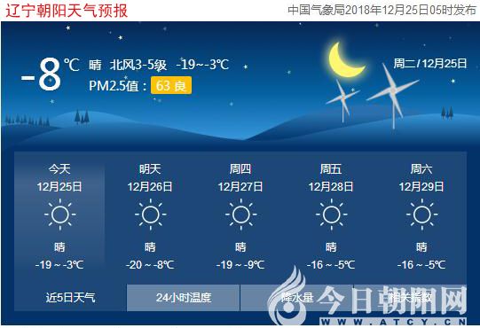 今天是2018年12月25日,星期二,農(nóng)歷十一月十九,遼寧朝陽晴,氣溫-19~-3℃,北風3~5級,空氣質(zhì)量良好。日出時間:07:23;日落時間:16:33。