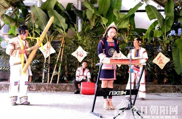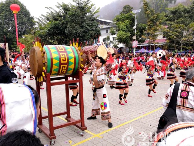 十點(diǎn)鐘,開(kāi)始祭大鼓儀式,七位長(zhǎng)老輪番獻(xiàn)上祭品,卓巴長(zhǎng)老誦念祭詞,握錘擊鼓,帶領(lǐng)人們跳大鼓舞,唱迎新辭舊的歌。由鐵匠牽著一只大公雞,在鐵匠爐宰殺,將雞血抹在所有打鐵的工具上,用鐵錘把一個(gè)雞蛋打碎。之后跳驅(qū)鬼舞,驅(qū)趕貧窮與災(zāi)難。祭祀儀式完成,所有的男人到廣場(chǎng)敲起大鼓芒鑼,跳起大鼓舞,女人孩子圍在一旁載歌載舞。