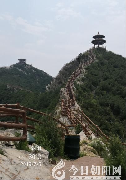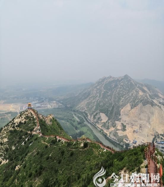 幾乎是爬著轉(zhuǎn)過(guò)幾個(gè)直立的拐角,眼前一亮,終于到達(dá)第二座涼亭。登泰山而小魯,站得高,看得遠(yuǎn),豁然開(kāi)朗。東顧,縣城輪廓分明,大凌河像哈達(dá)飄拂遠(yuǎn)去,一條寬闊的黑色路面傍河行走,車輛穿梭,植樹的,河道上建設(shè)新景觀的,螞蟻般辛勤,喀左全域發(fā)展旅游的綠色思路顯現(xiàn)出來(lái)。再看腳下,敖木倫河湖、濕地、河中島、木棧道隱現(xiàn)于山光水色中,綠林擁河,碧水潤(rùn)林,麗景映水的生態(tài)景觀,響應(yīng)著對(duì)面王子山懸崖上,那大大的福字,紅得驚心動(dòng)魄,勾畫著幸福美好的愿景。
