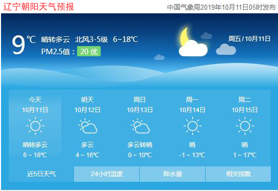 今天是2019年10月11日,星期五,農(nóng)歷九月十三。遼寧朝陽晴轉(zhuǎn)多云,氣溫6~18℃,東北風(fēng)3~5級,空氣質(zhì)量優(yōu)。日出時間:06:03;日落時間:17:26。(中國氣象局2019年10月11日05時發(fā)布。)請隨時關(guān)注天氣變化。