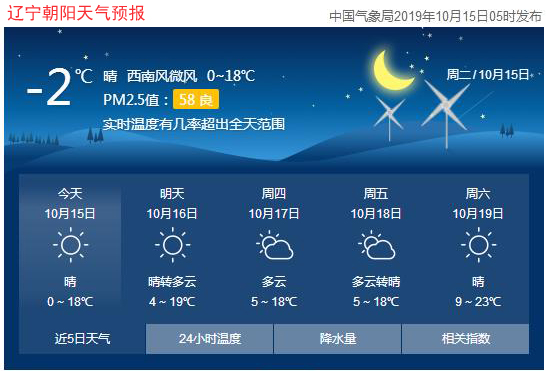 今天是2019年10月15日,星期二,農歷九月十七。遼寧朝陽晴,氣溫0~18℃,西南風3~5級,空氣質量優(yōu)。日出時間:06:08;日落時間:17:19。(中國氣象局2019年10月15日05時發(fā)布。)請隨時關注天氣變化。