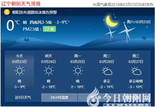 今天是2019年3月23日,星期六,農(nóng)歷二月十七。遼寧朝陽(yáng)晴,氣溫-3~9℃,西北風(fēng)4~5級(jí),空氣質(zhì)量?jī)?yōu)。日出時(shí)間:06:00;日落時(shí)間:18:12。