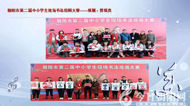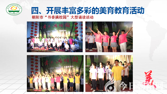 2016年學(xué)生表演的音詩(shī)畫團(tuán)體節(jié)目《我讀書我成長(zhǎng)我快樂》,在朝陽(yáng)市教育局、朝陽(yáng)市文廣新局和朝陽(yáng)廣播電視臺(tái)聯(lián)合主辦的“書香滿校園”大型誦讀活動(dòng)中,獲得導(dǎo)演組、專家領(lǐng)導(dǎo)的一致好評(píng),并被選送到凌河之夏——第五屆群眾文化節(jié)演出;2015年和2017在全市舉辦的兩屆“中小學(xué)合唱器樂舞蹈大賽”中我校連續(xù)囊括合唱組、器樂組、舞蹈組三個(gè)組別的第一名和團(tuán)體第一名。在2018朝陽(yáng)中小學(xué)書法、繪畫、色彩、剪紙、手工五項(xiàng)大賽中獲得多項(xiàng)一等獎(jiǎng)。