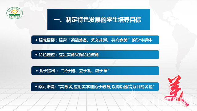 學(xué)校堅(jiān)持“以美育人”,全面提高學(xué)生審美和人文素養(yǎng)的辦學(xué)要求,堅(jiān)持以特色教育帶動(dòng)學(xué)校發(fā)展,從“辦適合學(xué)生的教育,辦人人發(fā)展的教育”的辦學(xué)理念出發(fā),以培育“德能兼?zhèn)洹⑺囄牟㈠?、身心?jìng)美”的學(xué)生群體為培養(yǎng)目標(biāo),大力實(shí)施特色教育。
