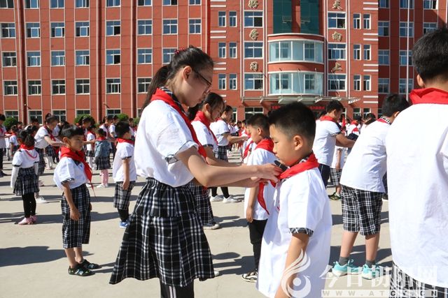 新隊(duì)員入隊(duì)儀式上,學(xué)校513名一年級(jí)新生經(jīng)批準(zhǔn)加入了少先隊(duì)組織,在六年級(jí)老隊(duì)員們的幫助下佩戴上鮮艷的紅領(lǐng)巾,成為了光榮的少先隊(duì)員。他們?cè)谏傧汝?duì)隊(duì)旗下跟著少先隊(duì)大隊(duì)長進(jìn)行莊嚴(yán)地入隊(duì)宣誓,新入隊(duì)的少先隊(duì)員代表用稚嫩的聲音向全校師生表達(dá)了成為少先隊(duì)員后的決心。