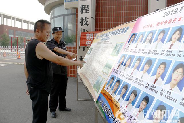 一位身著朝陽安平集團(tuán)保安隊(duì)服的保安員站在人群中,指著“朝陽工校2019年中職升本的學(xué)生金榜”展板上的學(xué)生照片,不無自豪地解說:“這個(gè)孩子名叫黨鯤昊,今年他考出了全校第一的好成績,被遼寧工程技術(shù)大學(xué)錄取了;這個(gè)小姑娘是18級(jí)建筑升學(xué)班的栗爽,她特別有心,考入了大連海洋大學(xué);這個(gè)孩子叫高綺龍,考入了沈陽農(nóng)業(yè)大學(xué);陳凱去了遼寧石油化工大學(xué)……看看,這75個(gè)孩子都出息嘍!”