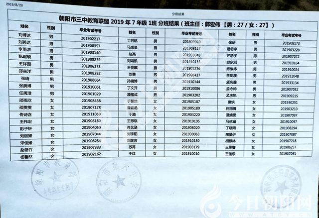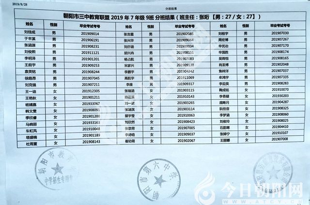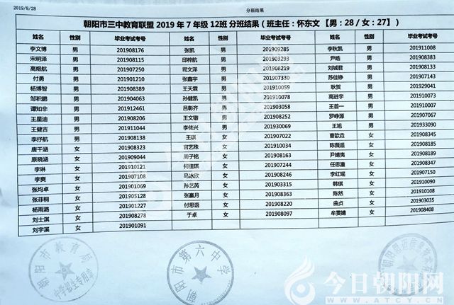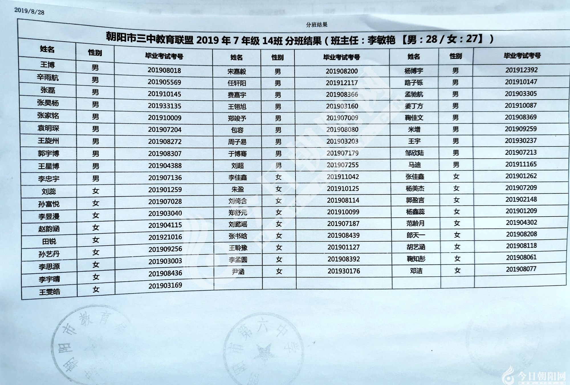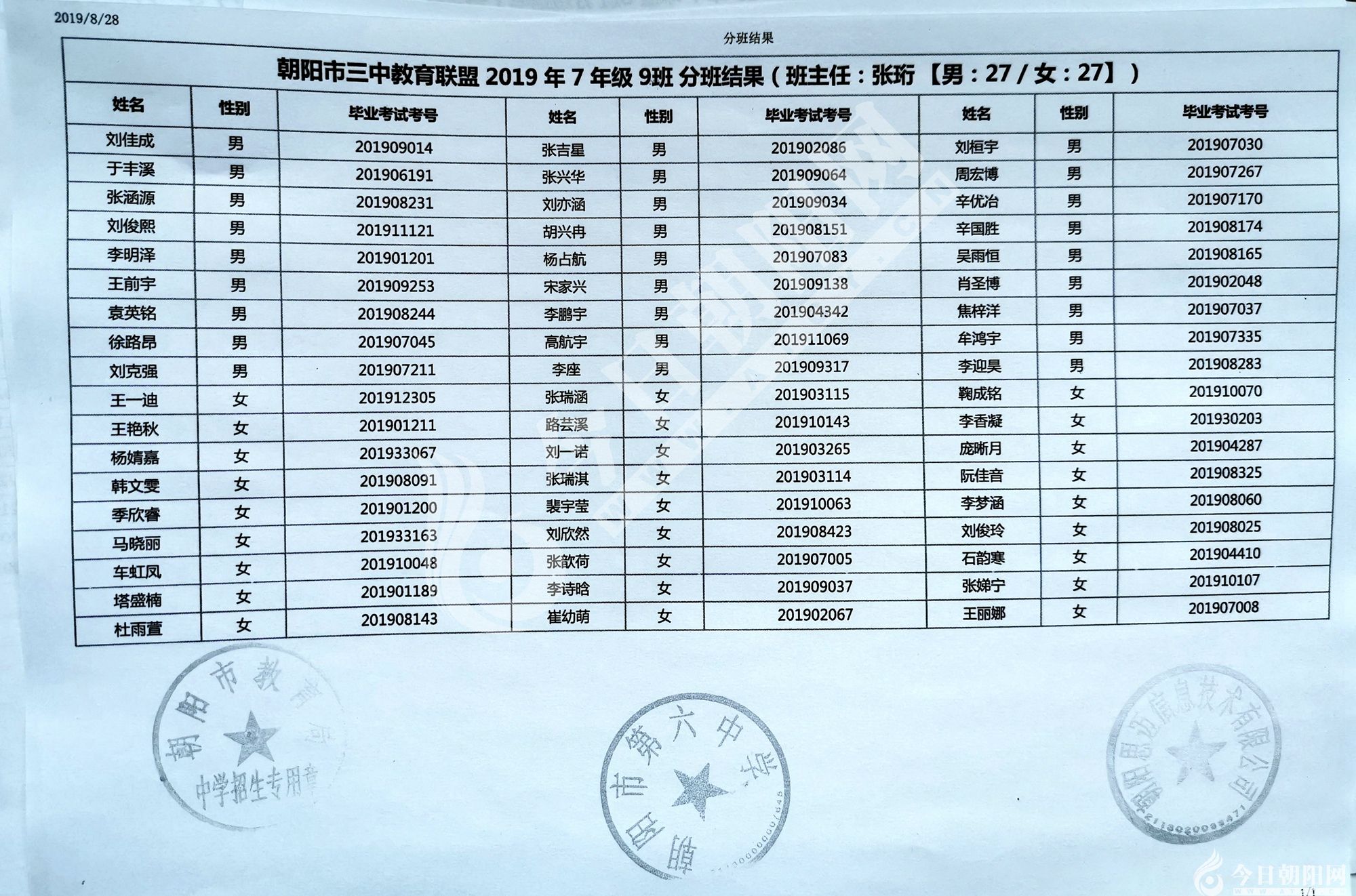 家長速看!朝陽市一中教育聯(lián)盟2019年新生分班表