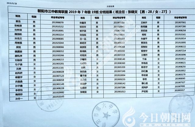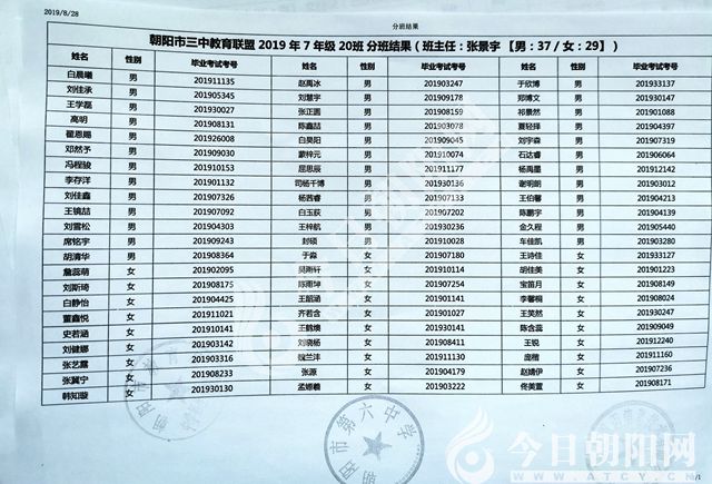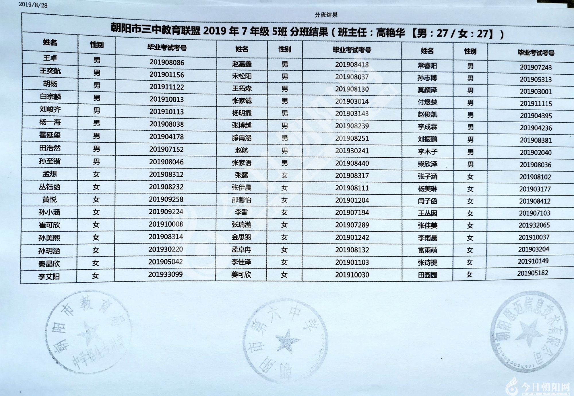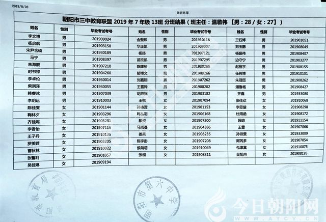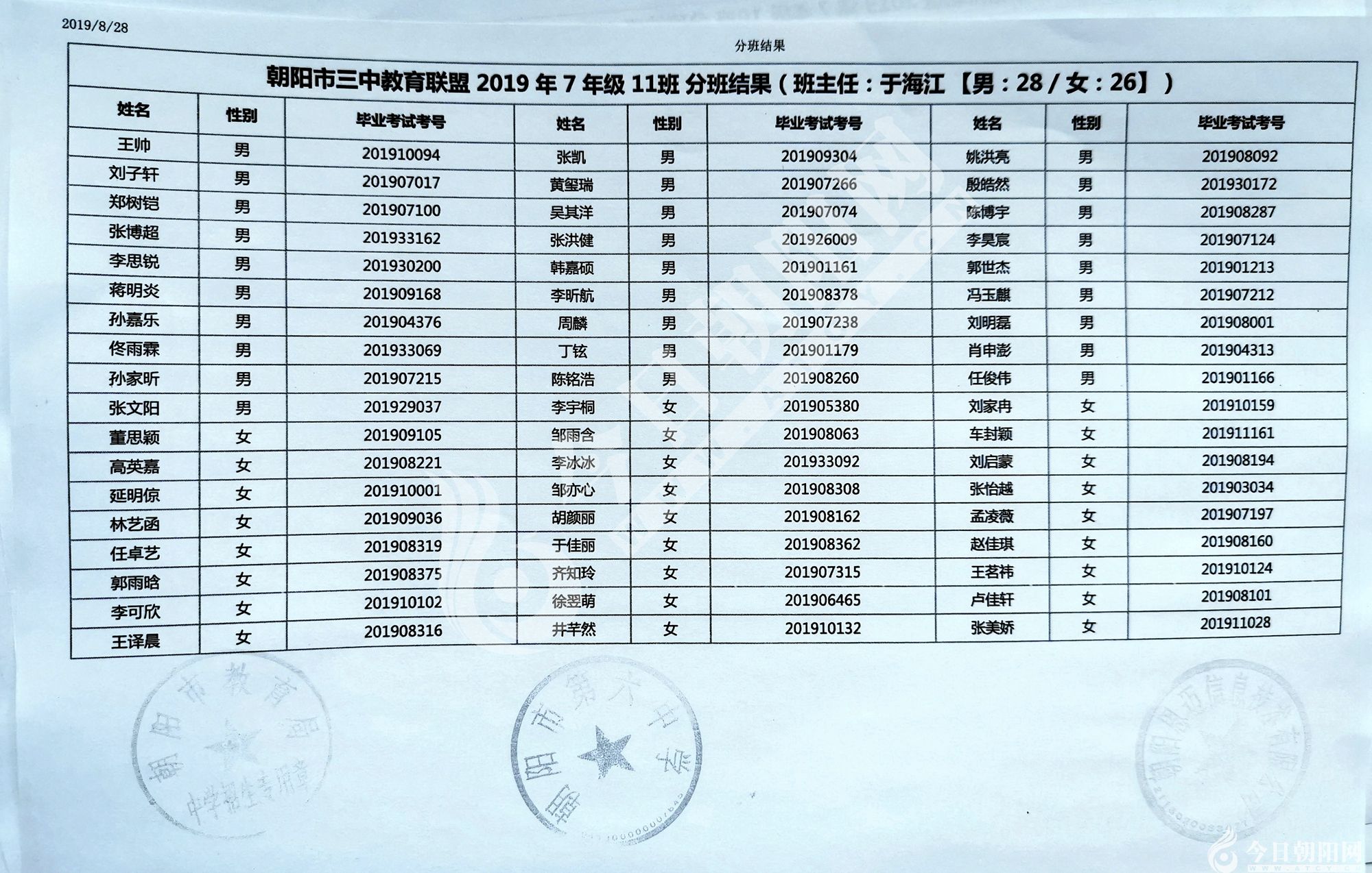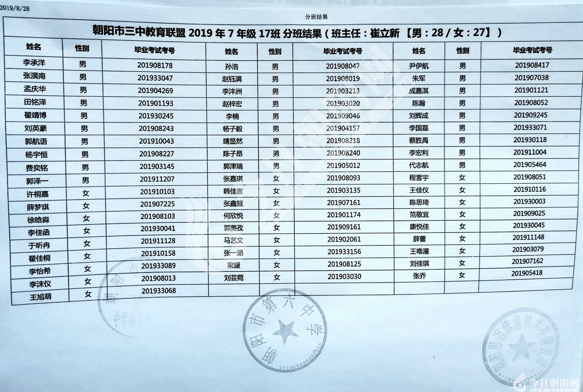 家長速看!朝陽市一中教育聯(lián)盟2019年新生分班表