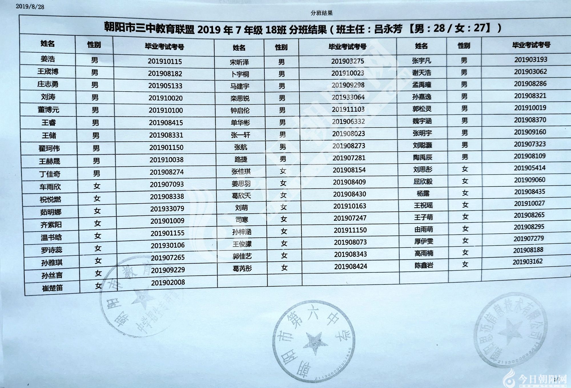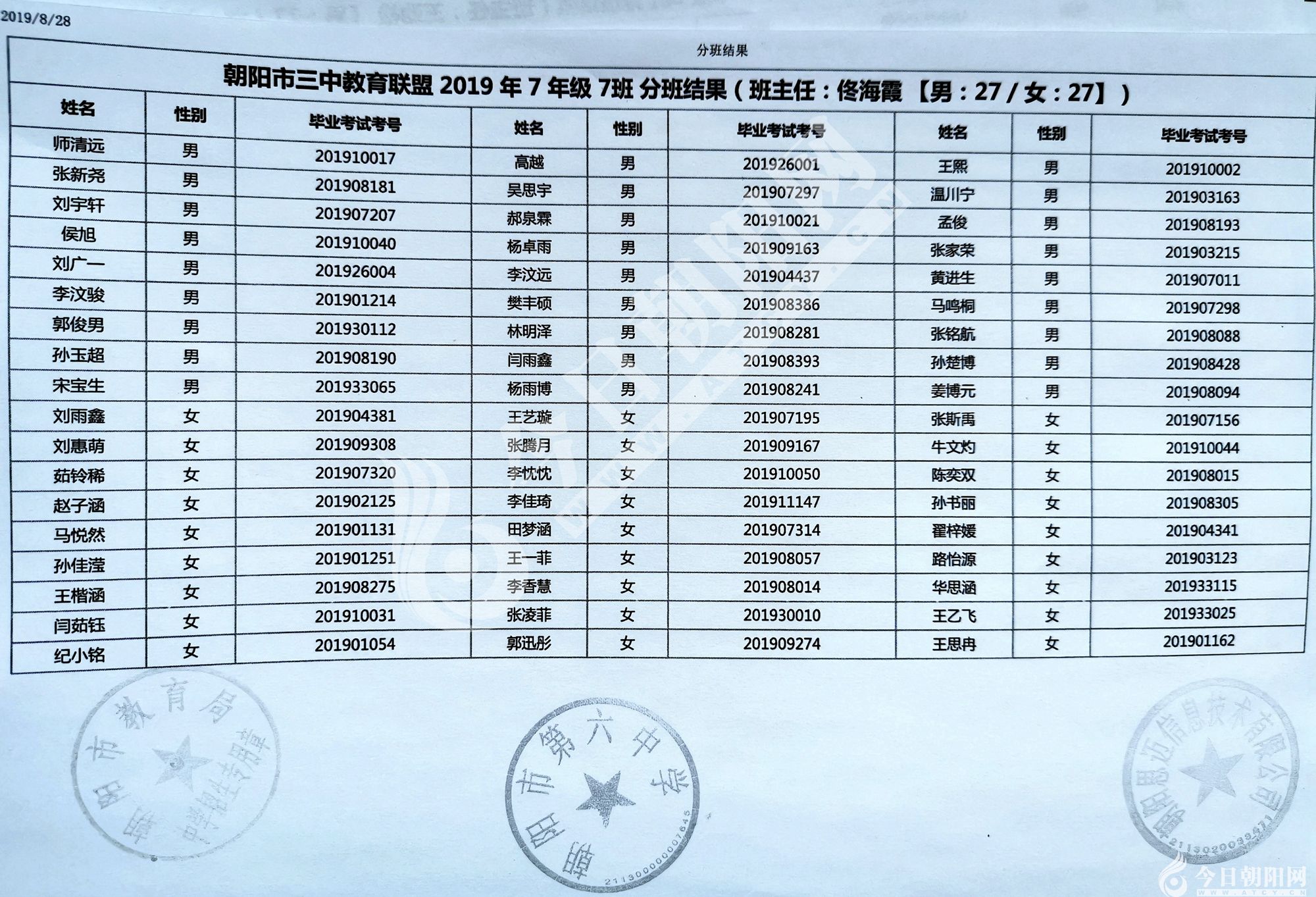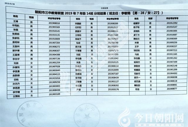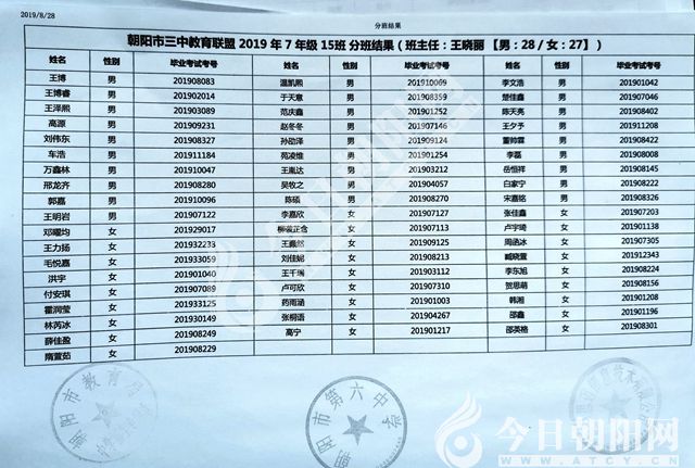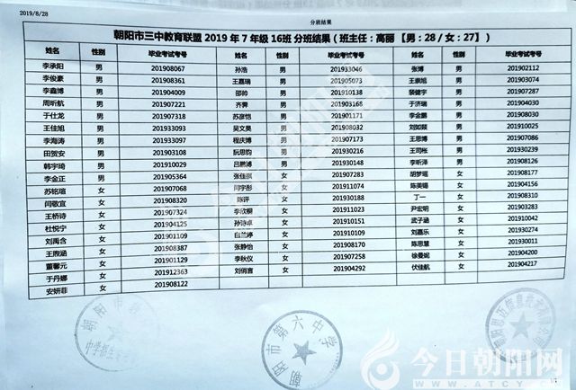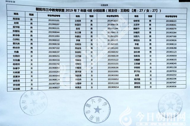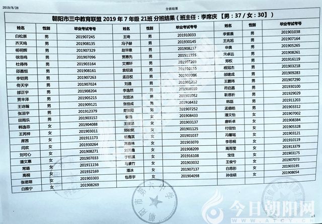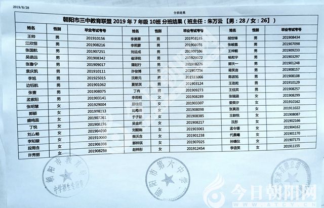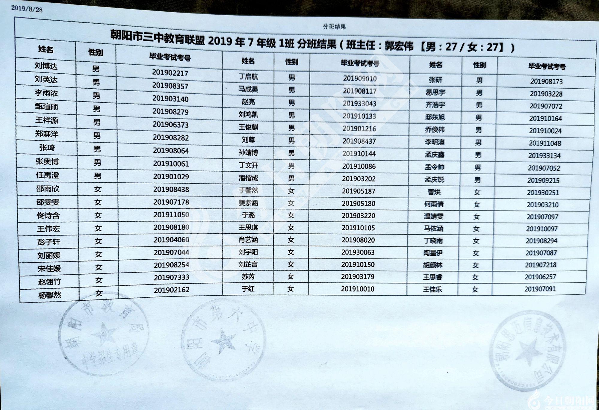 家長速看!朝陽市三中教育聯(lián)盟2019年新生分班表