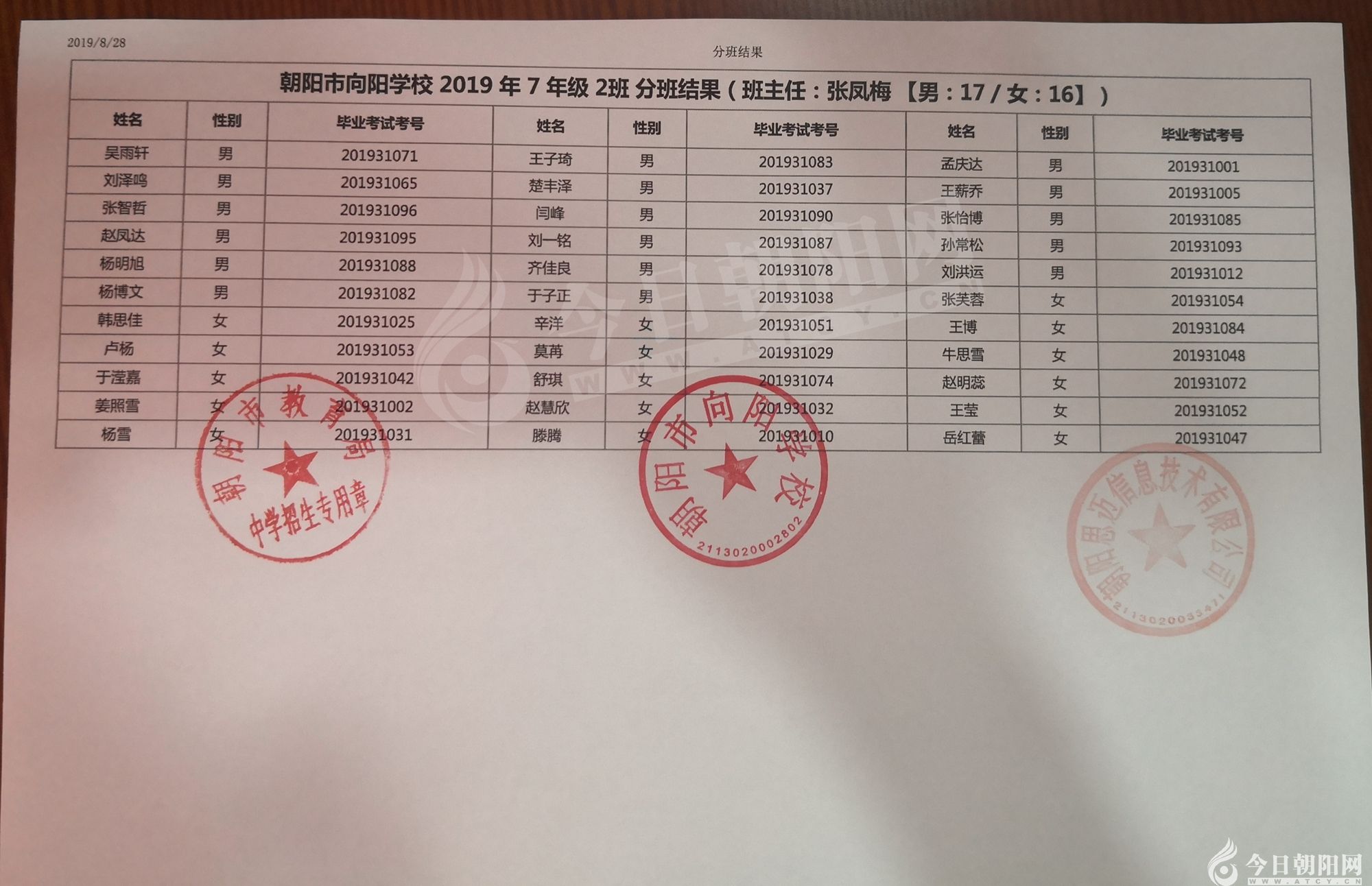家長速看!朝陽市三中教育聯(lián)盟2019年新生分班表