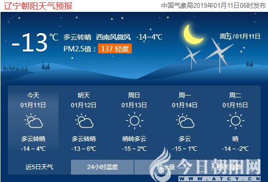 今天是2019年1月11日,星期五,農(nóng)歷臘月初六,“三九”第三天。遼寧朝陽多云轉(zhuǎn)晴,氣溫-14~4℃,西南風(fēng)3~5級(jí)??諝赓|(zhì)量:輕度污染,敏感人員外出時(shí)需戴好口罩。日出時(shí)間:07:25;日落時(shí)間:16:47。