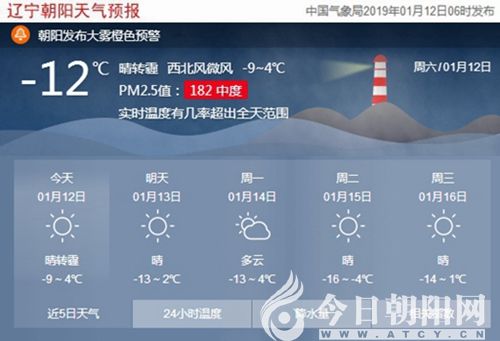 今天是2019年1月12日,星期六,農(nóng)歷臘月初七,“三九”第四天。遼寧朝陽(yáng)晴轉(zhuǎn)霾,氣溫-9~4℃,西南風(fēng)微風(fēng)??諝赓|(zhì)量中度污染,大家外出時(shí),需做好保護(hù)措施。日出時(shí)間:07:24;日落時(shí)間:16:48。