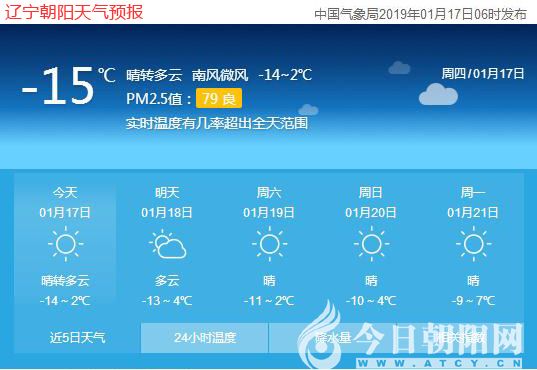 今天是2019年1月17日,星期四,農(nóng)歷臘月十二,“三九”第九天。遼寧朝陽(yáng)晴,氣溫-14~2℃,東南風(fēng)3~5級(jí),空氣質(zhì)量良好。日出時(shí)間:07:23;日落時(shí)間:16:54。