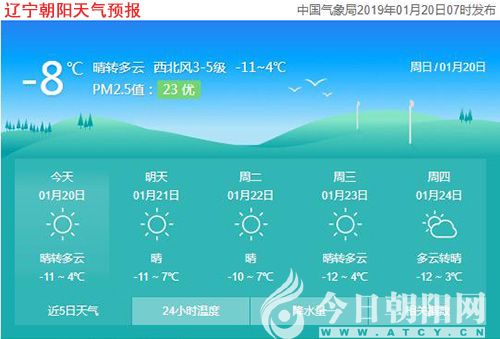 今天是2019年1月20日,星期日,農(nóng)歷臘月十五,“四九”第三天。遼寧朝陽晴,氣溫-11~4℃,西北風(fēng)3~5級,空氣質(zhì)量優(yōu)。日出時間:07:21;日落時間:16:57。
