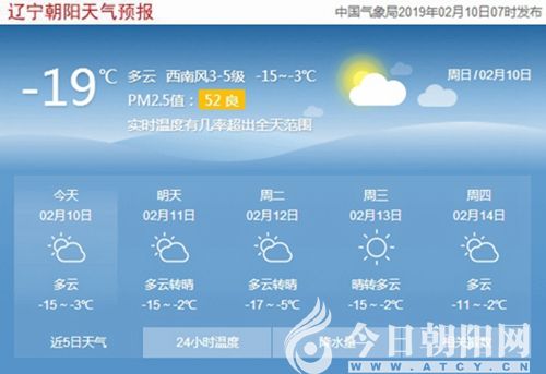 摘要:今天是2019年2月10日,星期日,農歷正月初六,“六九”第六天。遼寧朝陽多云,氣溫-14~-2℃,西南風3~5級,空氣質量優(yōu)。日出時間:07:02;日落時間:17:23。