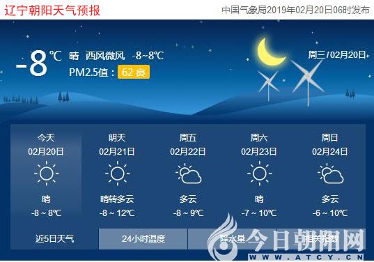 今天是2019年2月20日,星期三,農(nóng)歷正月十六,“七九”第七天。遼寧朝陽晴,氣溫-8~8℃,西北風3~5級,空氣質(zhì)量良好。日出時間:06:49;日落時間:17:36。