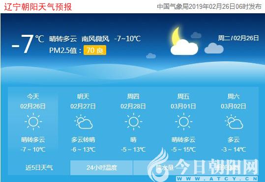 今天是2019年2月26日,星期二,農(nóng)歷正月二十二,“八九”第四天。遼寧朝陽(yáng)多云,氣溫-7~10℃,南風(fēng)微風(fēng),空氣質(zhì)量良好。日出時(shí)間:06:41;日落時(shí)間:17:44。