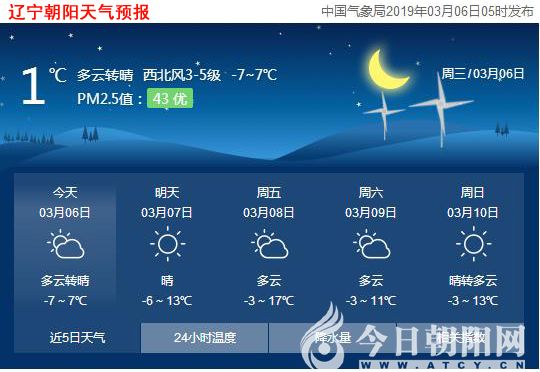 今天是2019年3月6日,星期三,農(nóng)歷正月三十,“九九”第三天。遼寧朝陽多云轉(zhuǎn)晴,氣溫-7~7℃,北風(fēng)5~6級(jí),空氣質(zhì)量?jī)?yōu)。日出時(shí)間:06:28;日落時(shí)間:17:53。