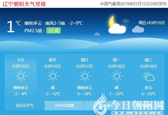 今天是2019年3月15日,星期五,農(nóng)歷二月初九。遼寧朝陽晴轉(zhuǎn)多云,氣溫-2~9℃,西北風(fēng)4~5級,空氣質(zhì)量優(yōu)。日出時間:06:13;日落時間:18:03。