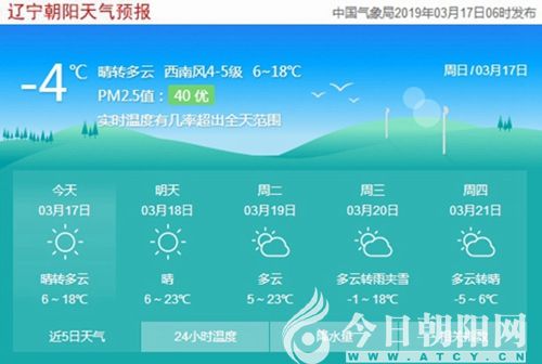 今天是2019年3月17日,星期日,農(nóng)歷二月十一。遼寧朝陽(yáng)晴,氣溫6~18℃,西南風(fēng)4~5級(jí),空氣質(zhì)量?jī)?yōu)。日出時(shí)間:06:10;日落時(shí)間:18:06。
