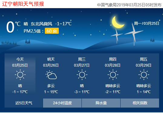 今天是2019年3月25日,星期一,農(nóng)歷二月十九。遼寧朝陽晴,氣溫-1~17℃,西北風3~5級,空氣質(zhì)量良好。日出時間:05:57;日落時間:18:14。