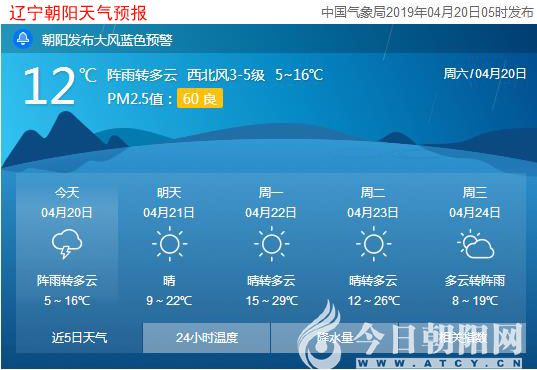 今天是2019年4月20日,星期六,農(nóng)歷三月十六。遼寧朝陽陣雨轉(zhuǎn)多云,氣溫5~16℃,西北風3~5級,空氣質(zhì)量良好。日出時間:05:14;日落時間:18:43。